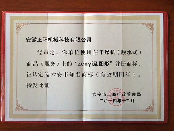 近日,安徽正陽機械科技有限公司“zenyi”牌干燥機(脫水式)商標經過申報、評選、公示等程序,正式被六安市工商行政管理局認定為六安市知名商標。這是公司全體員工共同努力的結果,是六安市工商行政管理局等政府職能部門親切關懷和大力支持的結果,標志著安徽正陽機械科技有限公司在品牌化戰略發展道路上又前進了一大步。